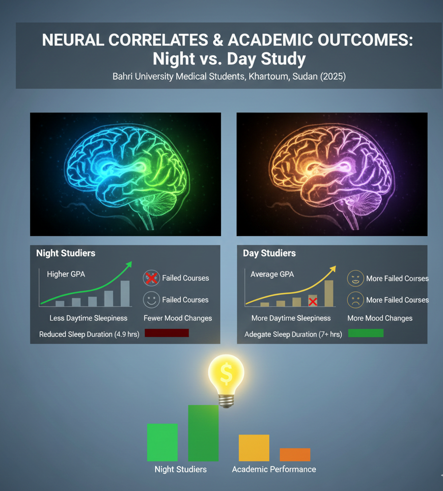 Medical students often adopt night-time study habits to cope with heavy academic loads and long curricula. While many believe that studying at night improves focus and productivity, the real impact of these patterns on academic performance and well-being is still unclear, especially in Sudanese medical schools.